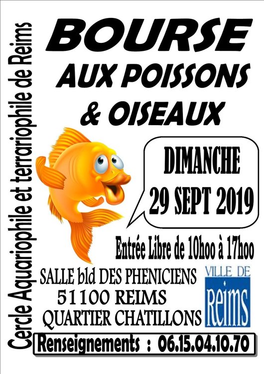 Bonjour à tous, comme deux fois par an je vous annonce notre prochaine manifestation. Le Dimanche 29 Septembre 2019, le Cercle Aquariophile et Terrariophile de Reims organise sa 74ème Bourse aux poissons, plantes et oiseaux. Un grand choix de poissons, oiseaux ou matériels seront proposés à tous nos visiteurs. De nombreux éleveurs amateurs venus de plusieurs régions nous présenterons leurs reproductions ainsi qu’un large choix de plantes aquatiques. Tout les passionnés de poissons, oiseaux trouverons un large choix d’espèces adaptées à chacun. Alors venez très nombreux pour une nouvelle réussite. Salle Boulevard des Phéniciens, quartier les Châtillons, REIMS 51100-MARNE. (face au collège Paul-Fort) Ouvert au public de 10h à 17h en entrée libre. Renseignements au 06.15.04.10.70 , sur notre page Facebook et notre site http://aqua.reims.free.fr