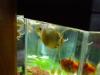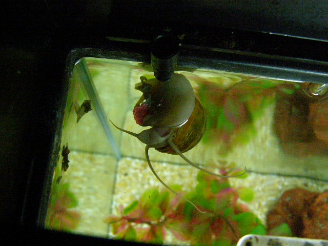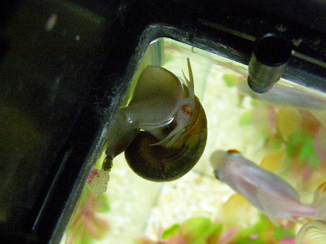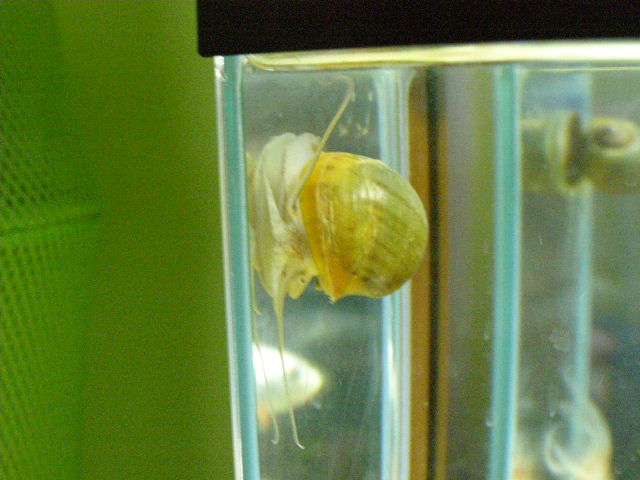 3. Bonjour, merci pour votre accueil. J'ai mis des photos d'Albert. C'est pas évident de prendre des photos claires mais peut-être que se sera suffisant pour que vous m'aidiez. Comme vous allez le voir, Albert n'est pas jaune mais plutôt verdâtre. Je crois que sa coquille commence à se détériorée donc c'est pour ça que je veux en savoir plus sur quoi faire pour remédier à cela. Est-ce qu'il y des aliments qui peuvent l'aider ou je dois absolument mettre des produits dans mon aquarium pour que l'eau devienne dure? J'ai des poissons et aussi d'autres escargots plus petits et je voudrais pas que ça leur nuisent. J'ai des escargot de fond, qui sont plutôt gris, et un autre qui lave les vitres parce que qu'Albert ne le fait pas. Concernant la nourriture, j'ai vu que dans les animaleries ils vendaient de l'algue sèchée. Est-ce que c'est bon pour Albert et aussi pour mes poissons par le fait même? Je m'interroge également pour quand je partirai en vacances. En ce moment, je nourris Albert en lui mettant un morceau de laitue dans le fond de l'aquarium et la faisant tenir par du gravier. Quand nous partons en vacances, ma belle-mère s'occupe de nos animaux mais je veux pas lui demander d'ouvrir l'aquarium, de plonger sa main et de mettre un morceau de laitue. Je nourris mes poissons avec un distributeur automatique lorsque nous partons en vacances mais je crois pas qu'Albert aura le temps de manger avant que mes poissons bouffent tout. A+