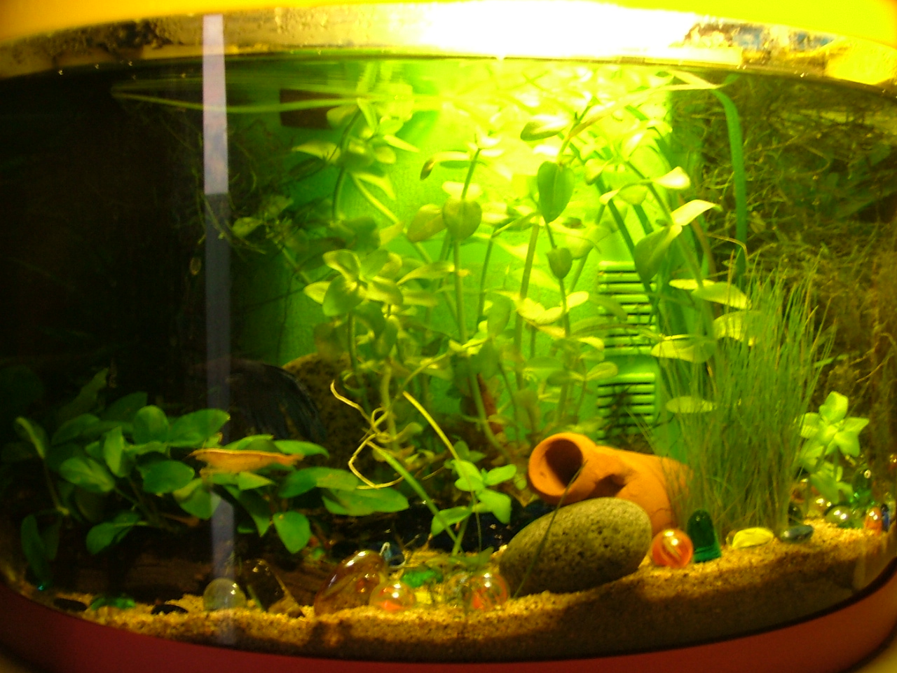 Voici mon bac à betta ou plutôt celui de mon fils mais l'entretien ne l'intéresse pas vraiment ... lol Je suis étonnée du temps que je consacre à ce petit aquarium. Peut-être un jour en aurais-je un comme le tien.. Merci de me donner ton avis sur cette végétation. A+ Fab