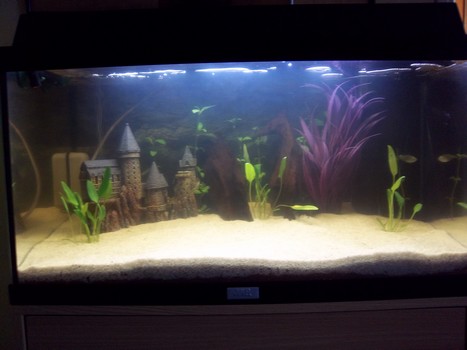 Bonsoir à tous et à toutes! Tout d'abord, bonne et heureuse année 2011 à tout les membres du forum, toute l'équipe, etc... Oui, je suis Marnic, le fiancé de Souricity62, je prends la relève. Aaaah ces sangsues... Oui, même si on a pas de photo VALABLE (en grosse lettres pour quelqu'un qui ne vois pas assez) on est capable de reconnaitre des photos par rapport à ce qu'on a. Bon, je viens de refaire l'aquarium, depuis le 02 Janvier après un nettoyage extremement minutieux. Il faut dire qu'on a passé plus d'un mois à regarder tout les matins, juste après avoir allumé la lumière à observer si de nouvelles sangsues apparaissaient. Il y en a eut en continue, malgrès nos efforts pour les retirer. L'aquarium était blanc de Bicarbonate de soude (ca bouffe tout ca,... (en générale)). Rincage minutiueux également. J'ai même décollé le filtre fixé à l'aquarium et recollé avec du silicone. Nettoyage idem pour les décors. Je remet de l'eau... J'ai mis les premières plantes 48h après. Les plantes, parlons-en! Je les ais nettoyées, séparé les tiges, taillées, REregardé, retournés et REretourné dans tout les sens (vous me comprennez), elles ont l'air... nikels. il faut dire que je n'ai pas du tout acheté au même magasin qu'avant. deux types de plantes: des Cryptocoryne petchii et des Hygrophila polysperma. J'ai, par contre, ajouté cette fois-ci pour éviter la même erreur que la première fois (héhé) ajouté dans le fond, du terreau pour les plantes. L'aquarium à un tout nouveau "paysage". Voici les photos: